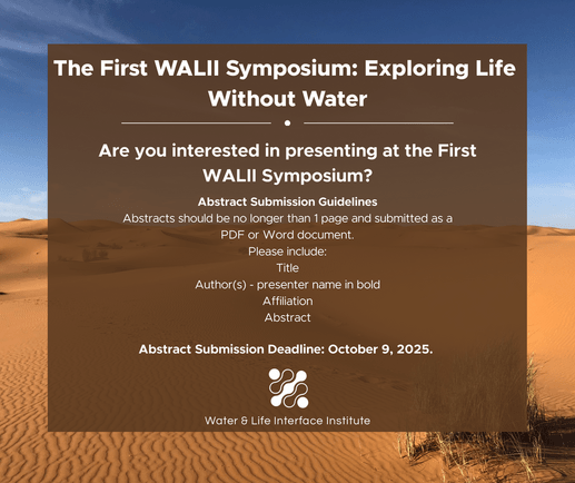 Anhydrobiosis is the process by which organisms and cells dehydrate, remain viable in a desiccated state, and resume function after rehydration. This process that allows organisms to tolerate desiccation is not well understood. In this new webinar series, hosted by NSF’s Water and Life Interface Institute (WALII), we will learn about the latest research from scientists around the world studying anhydrobiosis across organisms, scales, and disciplines. Please join us on December 5 at 8 am PT, 9 am MT, 10 am CT, and 11 am ET for a talk by Dr. Duncan Ryan from Los Alamos National Laboratory.